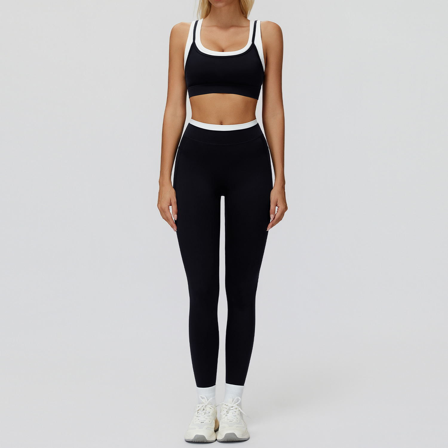 Women’s 2 Piece Yoga Set, White Trim Crop Top + High Waist Leggings, Black